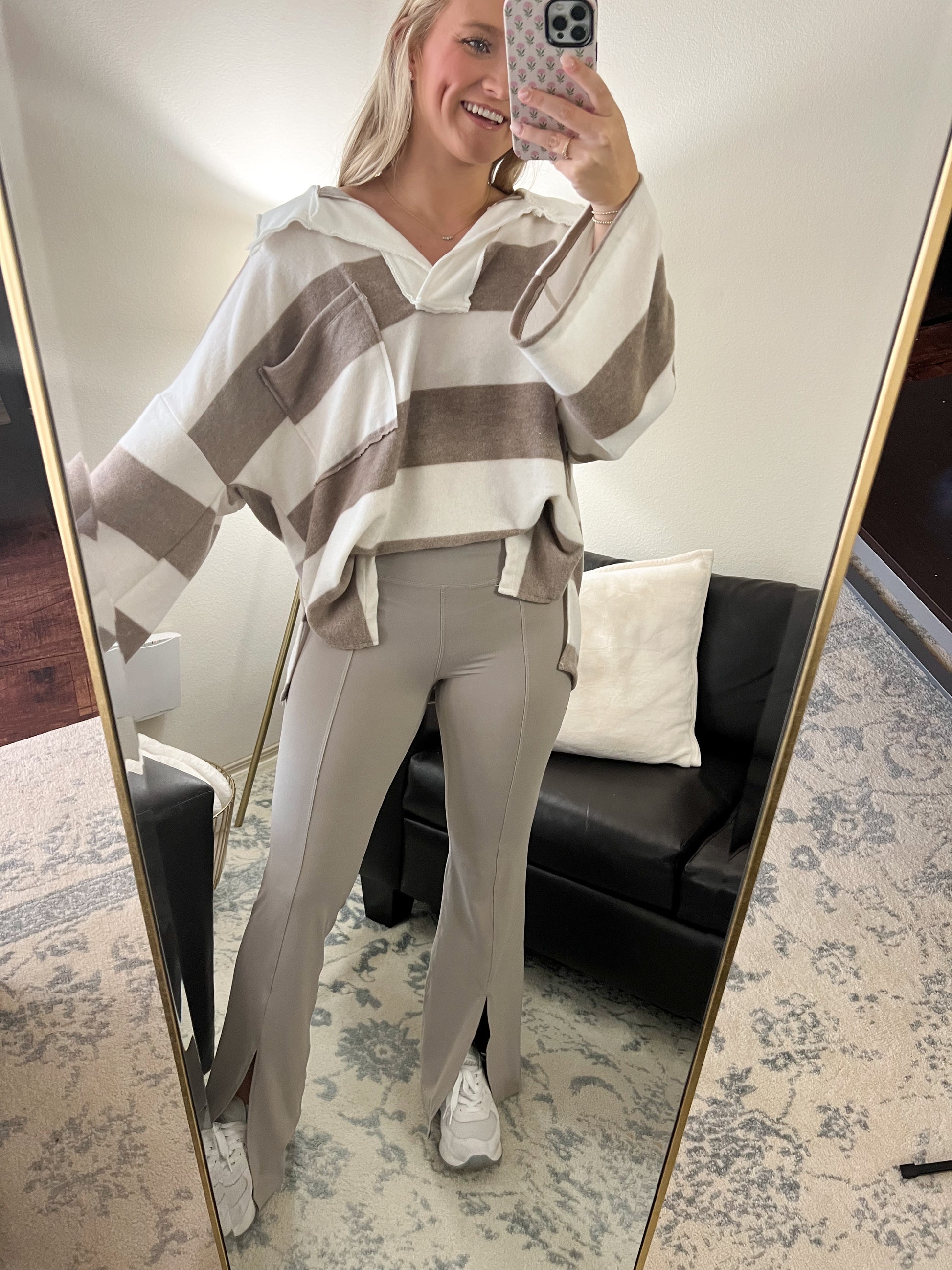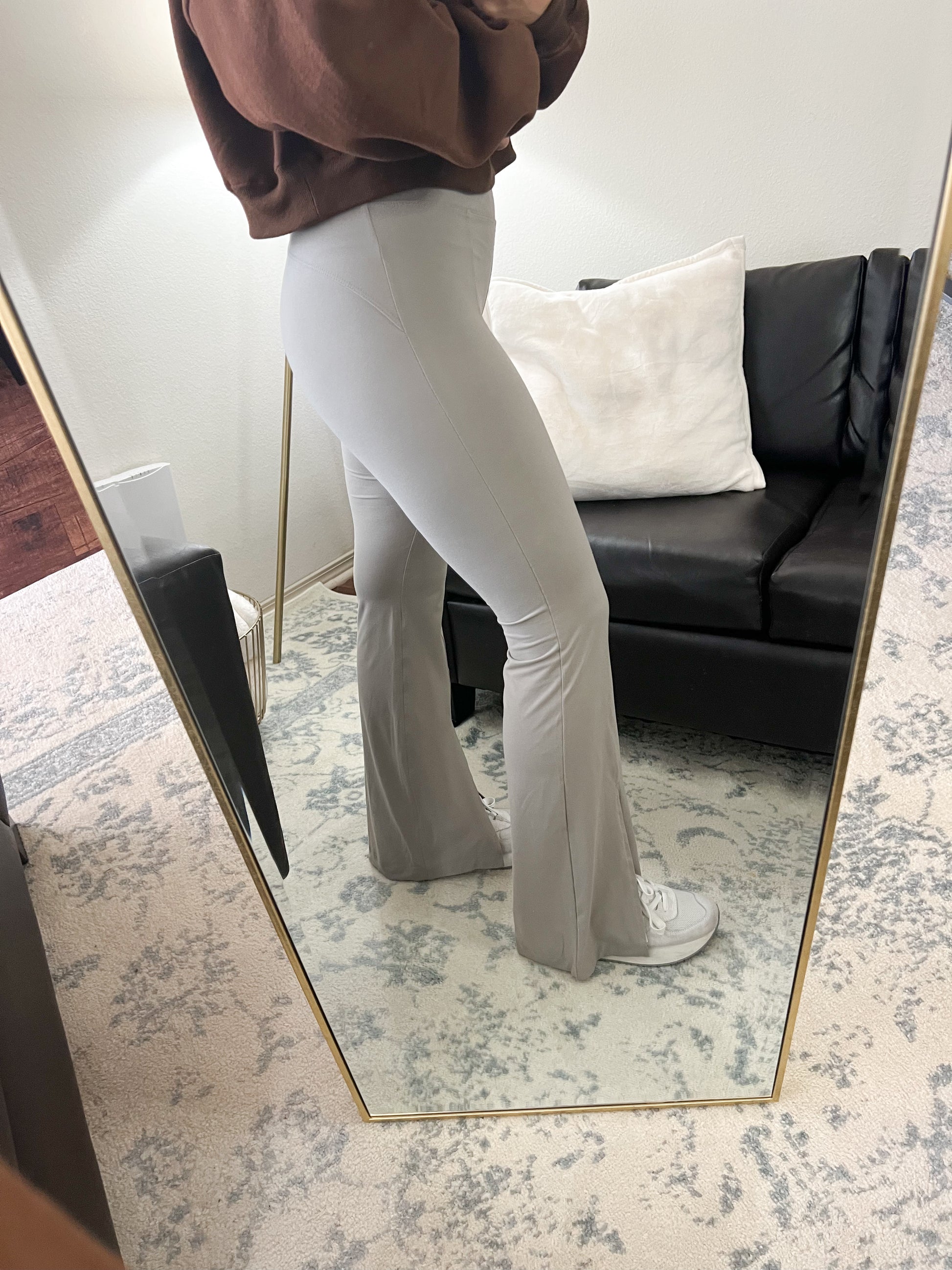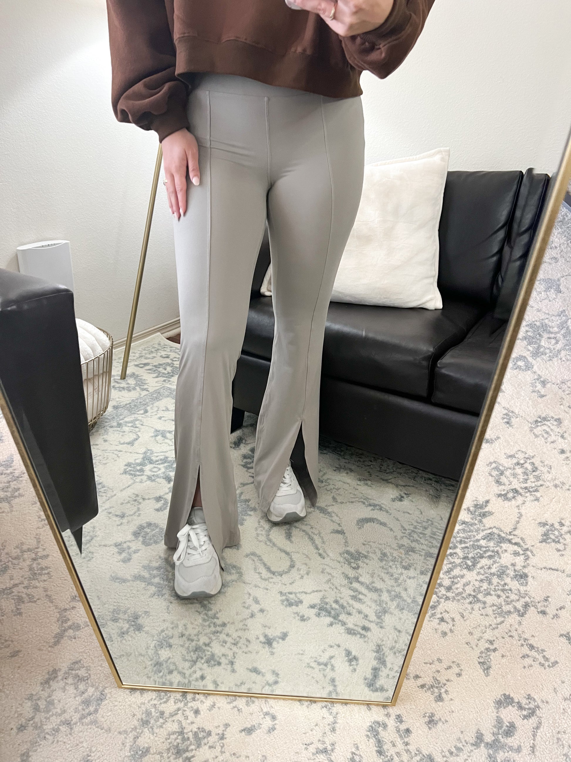 Smooth Split Flare Legging - Stone Taupe. Elevate your comfort and style with our smooth as butter flare leggings, made from eco-friendly recycled fabric. Featuring a front slit flare with seaming detail, a secret mini pocket in the high waist band, and a slim fit, these pants have it all.